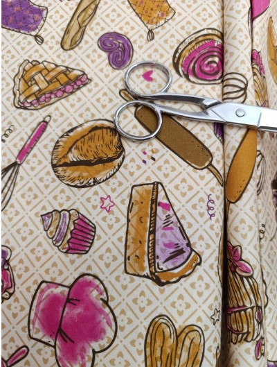 Tela de algodón estampado pastelería , 100% algodón, suave y transpirable. Estampado floral de alta resolución para un toque elegante. Peso ligero, ideal para prendas frescas. Ancho estándar, versátil para diversos proyectos. Duradera y perfecta para moda y decoración. para vestidos, camisas, confeccionar sábanas , fundas nordicas , cojines