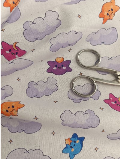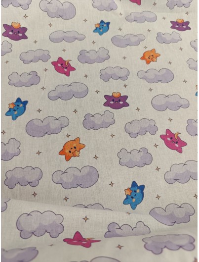 Tela de algodón estampado nubes y estrellas , 100% algodón, suave y transpirable. Estampado floral de alta resolución para un toque elegante. Peso ligero, ideal para prendas frescas. Ancho estándar, versátil para diversos proyectos. Duradera y perfecta para moda y decoración. para vestidos, camisas, confeccionar sábanas , fundas nordicas , cojines