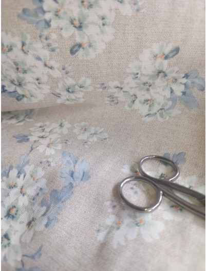 Tela Loneta con estampado flores azules fondo piedra , para manteles, tapiceria, cortinas, cojines y decoracion del hogar en general. Ideal tambien para mochilas, bolsas de tela...