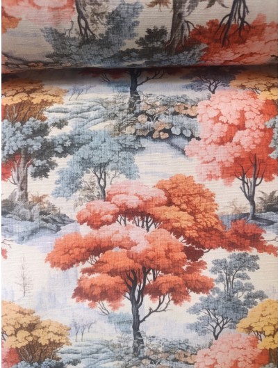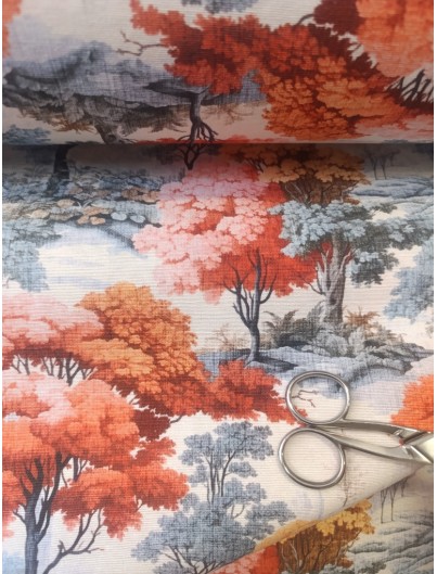 Tela Loneta con estampado de árboles naranja quemado y gris, para manteles, tapiceria, cortinas, cojines y decoracion del hogar en general. Ideal tambien para mochilas, bolsas de tela...