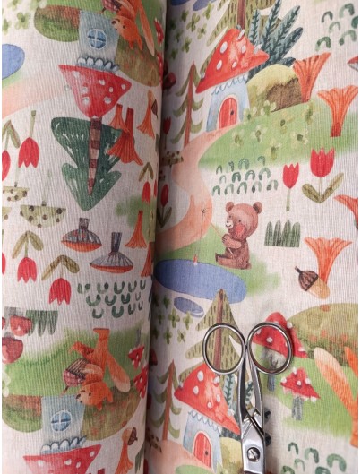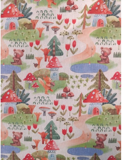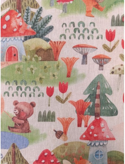 Loneta estampado setas, ositos y zorros . Perfecta para manteles, tapiceria, cortinas, cojines y decoracion del hogar en general. Ideal tambien para mochilas, bolsas de tela...