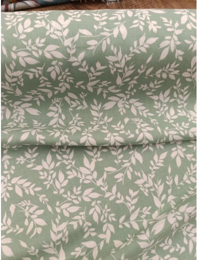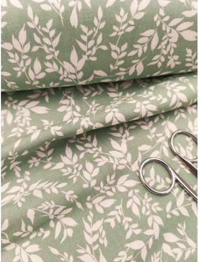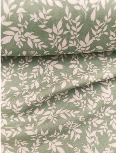 Tela viscosa ramas blancas fondo verde. Suave, ligera y con caída fluida, ideal para vestidos, blusas y más.